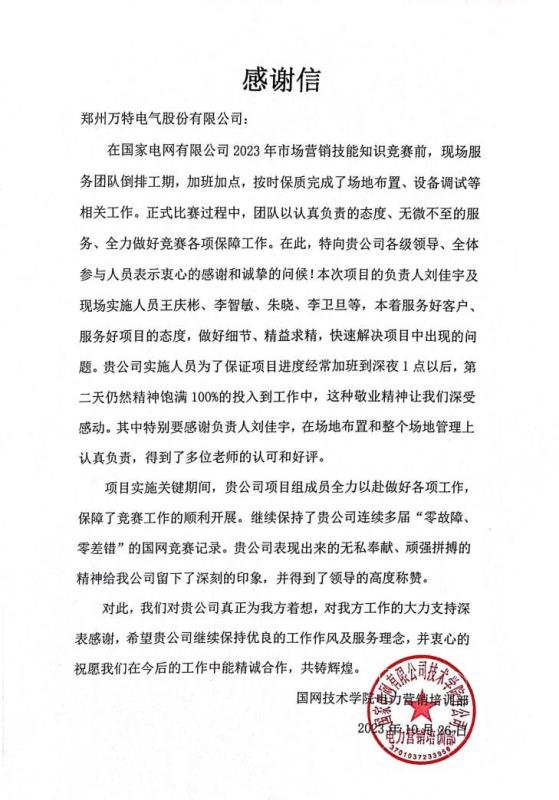 2023年10月,国家电网公司2023年市场营销技能知识竞赛在国网技术学院落下帷幕。在这场盛大的赛事中,我公司以卓越的产品性能和精准的服务支持,保持了产品“零差错、零故障”运行,赢得了业界和评委们的一致好评。
