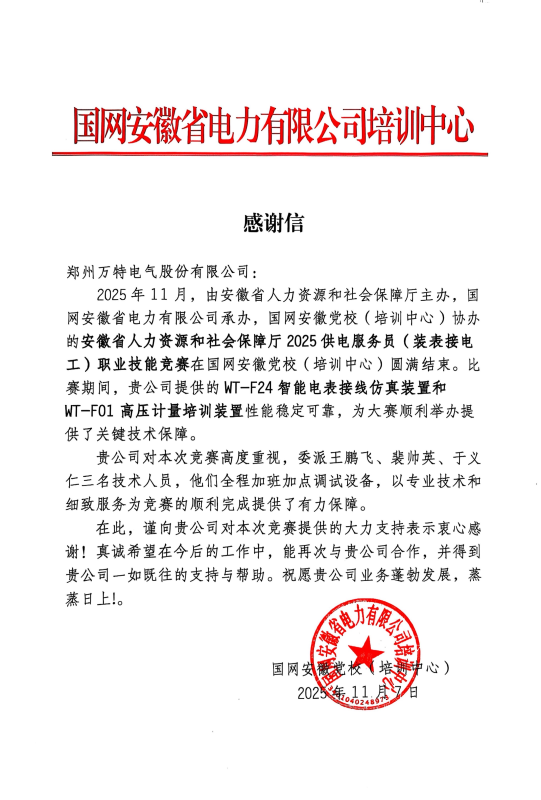 “比赛期间,贵公司提供的WT-F24智能电表接线仿真装置和WT-F01高压计量培训装置性能稳定可靠,为大赛顺利举办提供了关键技术保障。