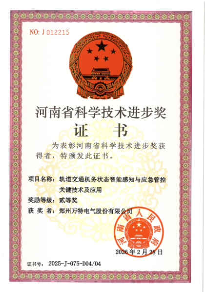近日,郑州万特电气股份有限公司凭借“轨道交通机务状态智能感知与应急管控关键技术及应用”项目,荣获2025年度河南省科学技术进步奖贰等奖,彰显了公司勇于创新的进取精神。