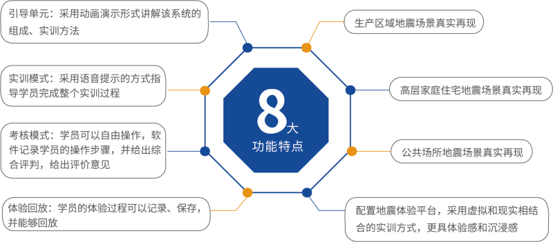 本项目在虚拟场景中搭建地震VR 体验场景,针对日常生活中不容易触及到的自然灾害场景,进行现场虚拟化 再现,让体验者在感官上达到真实效果,从而达到实训的目的。