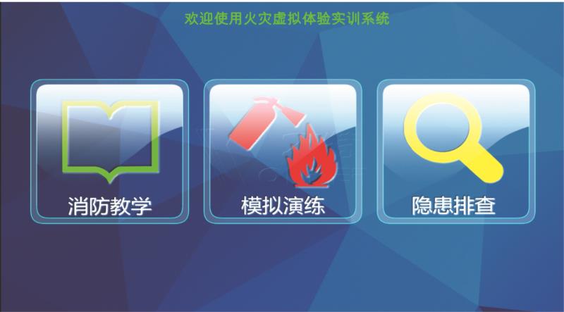 虚拟灭火体验实训系统采用公司自主研发的动作识别系统,3D 虚拟现实、无线通信等多种先进 技术手段。该系统分为消防教学、模拟演练、隐患排查三大部分。虚拟灭火体验实训系统配置 多种检测、评测模块,通过对灭火器状态的数据采集实现整个灭火流程的测评,达到自动检 测、自动判断、自动评分的效果。
